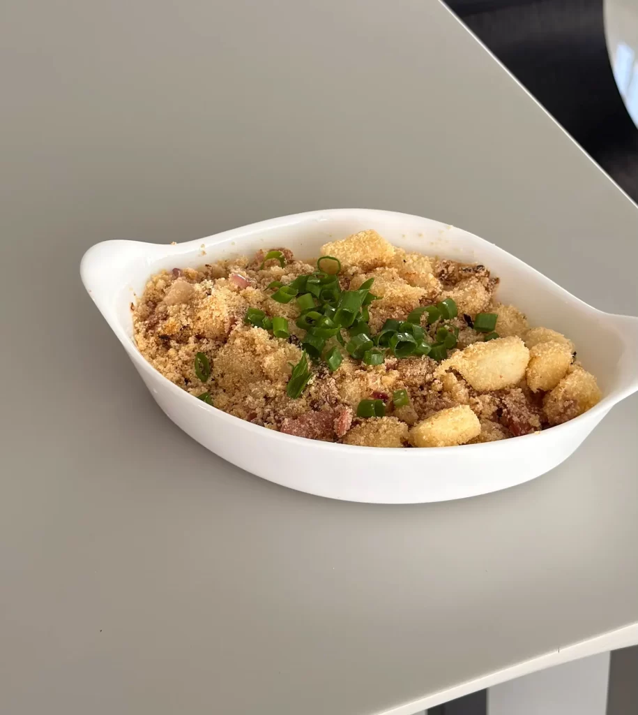Farofa natalina com abacaxi e bacon combina o crocante do bacon com o toque agridoce do abacaxi, criando um acompanhamento equilibrado, aromático e perfeito para a ceia de Natal, trazendo sabor e tradição à mesa.